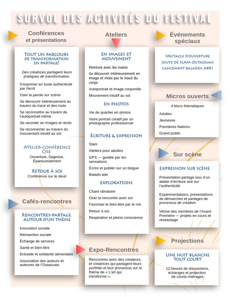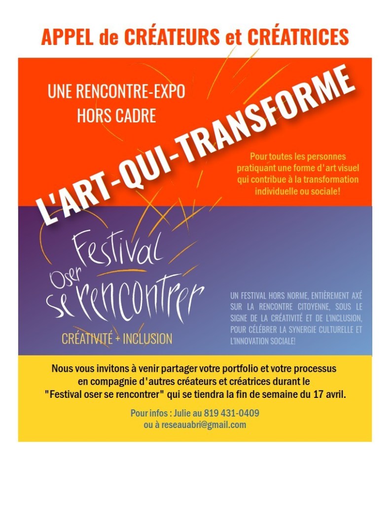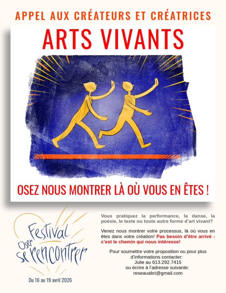 Ce nouveau festival se veut une réponse à une tendance de beaucoup de personnes depuis la pandémie à rester chez soi et à se contenter d’événements virtuels. L’initiative a été lancée par le réseau l’ABRI en partenariat avec l’Espace DEP Sylvestre et plusieurs autres organismes dont l’Avant première!