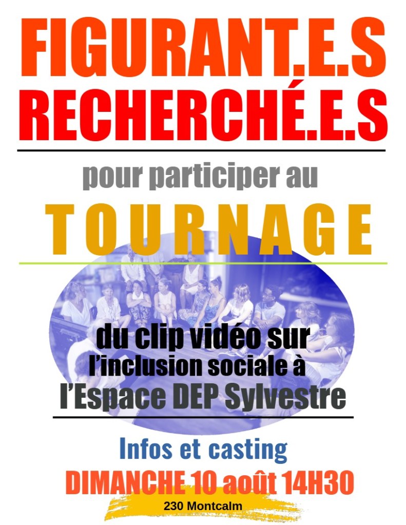 Vous êtes invité.e à choisir un rôle dans le tournage de la vidéo sur l’inclusion sociale au DEP, et également à participer à la scénarisation de la vidéo! Nous procéderons en même temps au casting des figurant.e.s qui apparaîtront dans la vidéo pour interpréter les divers types d’entraide et d’implication communautaire à l’Espace DEP Sylvestre!