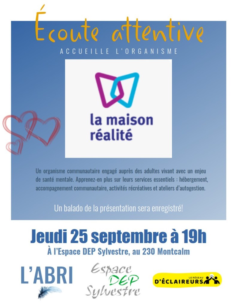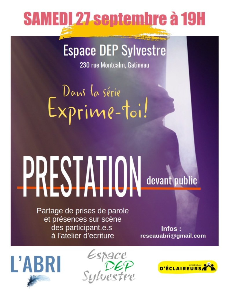 Jeudi 25 septembre à 19h à l’Espace DEP Sylvestre, 230 rue Montcalm, Gatineau (secteur Hull)