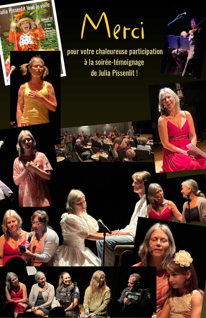 Certains d’entre-vous ont peut-être déjà rencontré l’animatrice de rue Julia Pissenlit lors d’un événement. Elle vous a peut-être surpris, amusé, ou amené un peu de légèreté dans votre journée! Et pourtant derrière son exubérance et ses rires enjoués se cache une vie tourmentée par des réminiscences d’abus. Lors de cette soirée-événement, Julia révèle cette détresse qui a profondément marqué son existence et ses relations.