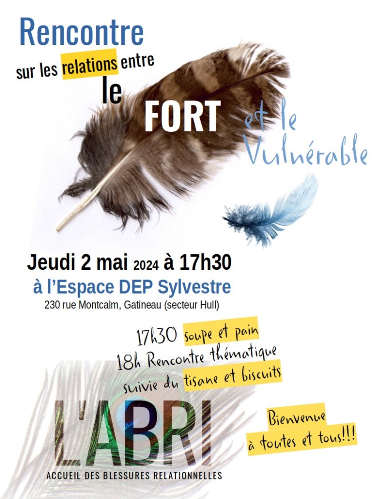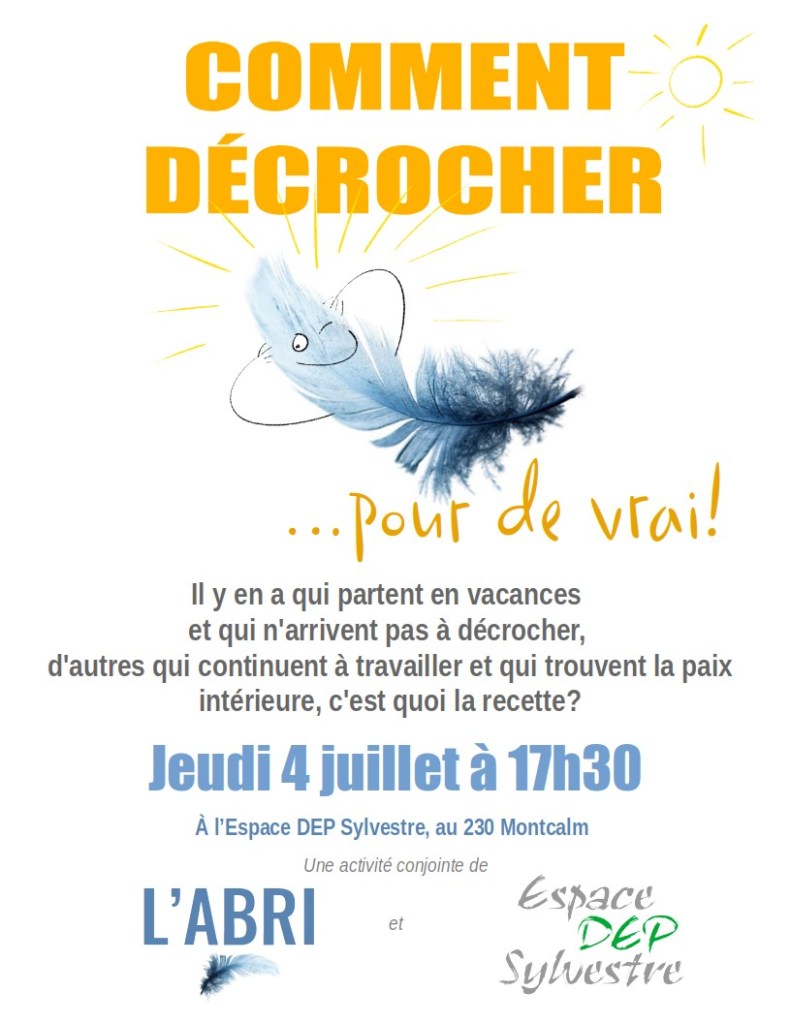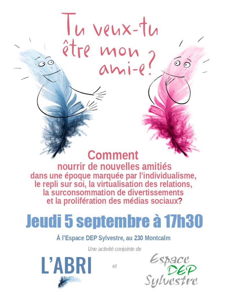 L’ABRI organise, en partenariat avec l’Espace DEP Sylvestre et d’autres organismes, plusieurs rencontres et activités mensuelles. Un des premiers objectifs du réseau d’entraide et de proche aidance est de favoriser la reprise du dialogue entre les individus isolés et également entre les divers groupes d’appartenance. Qu’il s’agisse de groupes culturels, générationnels ou sociaux.