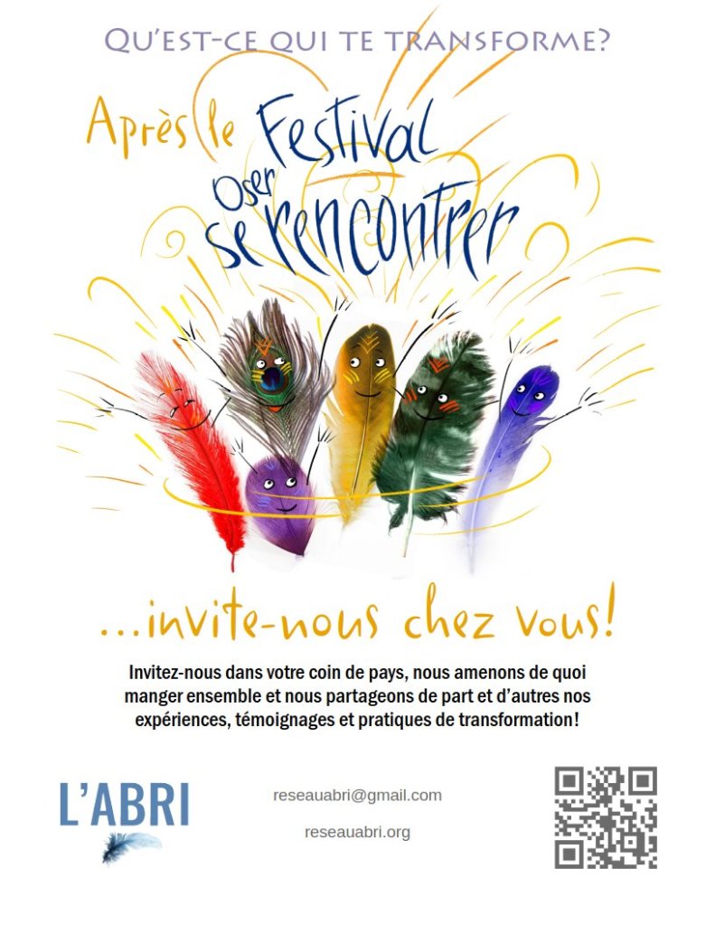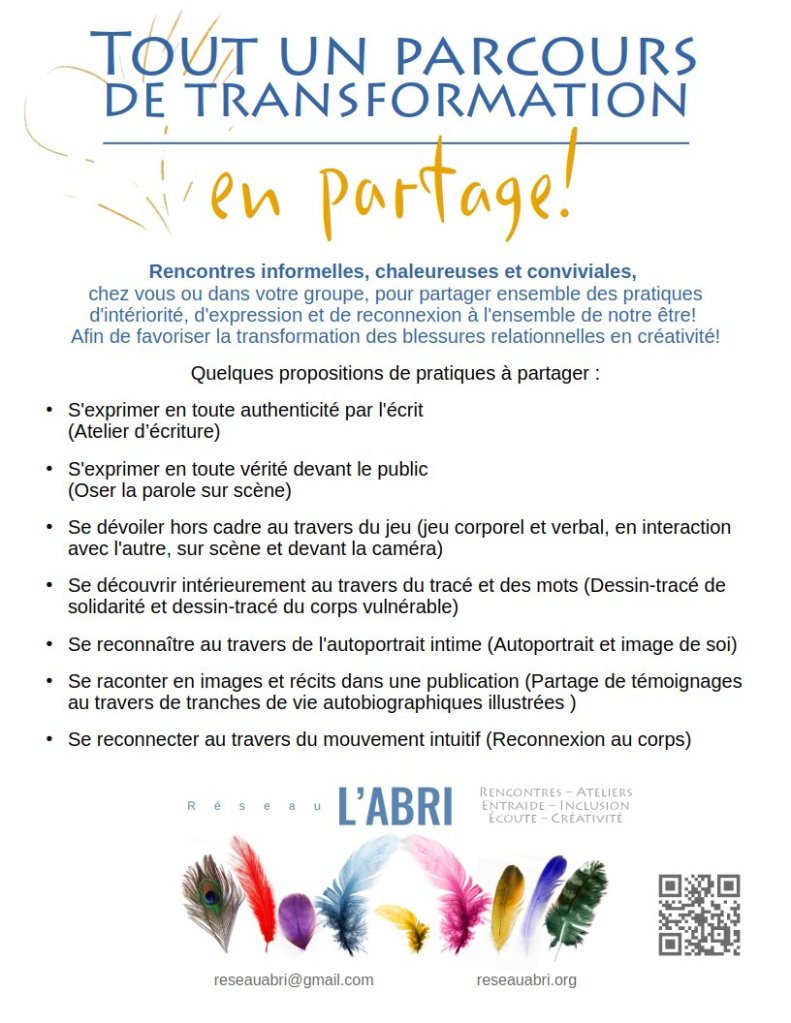 « Tout un parcours de transformation en partage » a été créé à l’initiative des membres du réseau l’ABRI. Le but étant de partager les expériences du réseau auprès d’individus et de communautés dans un rayonnement plus large, au-delà de la collectivité locale. Il s’agit de rencontres informelles, chaleureuses et conviviales, dans lesquelles les personnes partagent de part et d’autre leurs expériences, témoignages et pratiques de transformation des blessures relationnelles en créativité!